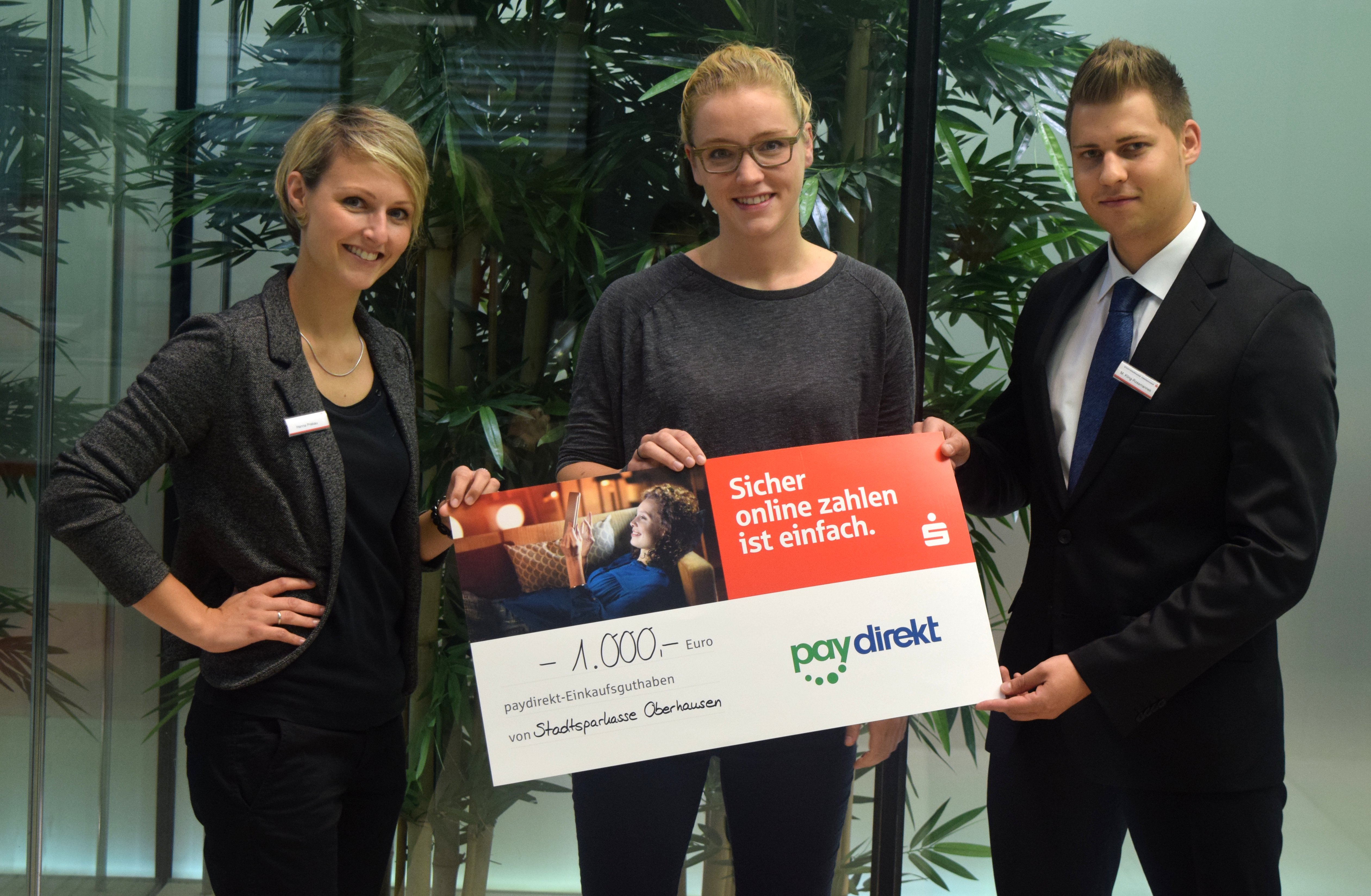 Stadtsparkasse Oberhausen gratuliert glücklicher Gewinnerin zu 1.000,- Euro Einkaufsgeld von paydirekt.